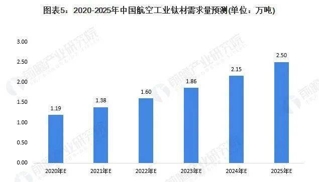 3、國內(nèi)高端鈦合金市場呈“雙寡頭”競爭格局 在國內(nèi)鈦合金市場中,目前能夠批量生產(chǎn)軍用航空鈦合金棒絲材的企業(yè)主要是:西部超導(dǎo)、寶鈦股份和湖南金天鈦業(yè)科技有限公司。 4、航空航天用鈦材需求前景廣闊 2009-2017年,中國航空航天用鈦材銷量的年復(fù)合增長率為16%,同時(shí)考慮到國內(nèi)目前航空航天用鈦材占比遠(yuǎn)低于全球范圍內(nèi)航空航天用鈦材占鈦材總需求的50%的比例,假設(shè)未來幾年年的復(fù)合增長率保持不變,至2025年,我國航空工業(yè)鈦材需求量將達(dá)2.5萬噸。